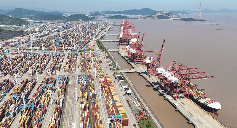 货轮停靠在宁波舟山港穿山港区装卸货物(2023年5月9日摄,无人机照片)。新华社记者 翁忻旸 摄